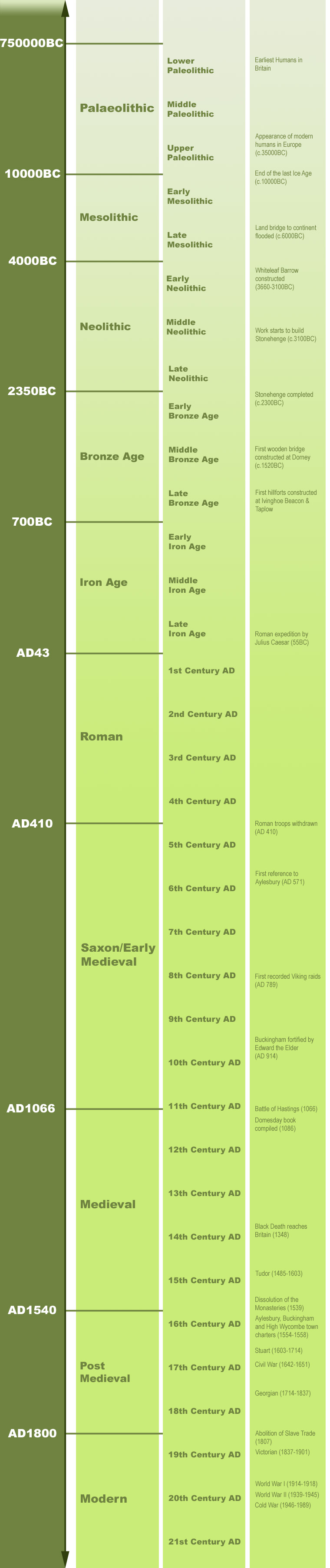The timeline shows history from the earliest period when people first arrived in Buckinghamshire to the modern day. Hover over the time periods on the left for a brief explanation and click to see more information. Use your browser scroll bar to move backwards and forwards through time.